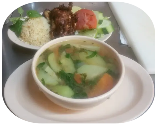 Sopa de hueso de res con vegetales servida con una orden de arroz y 2 tortillas