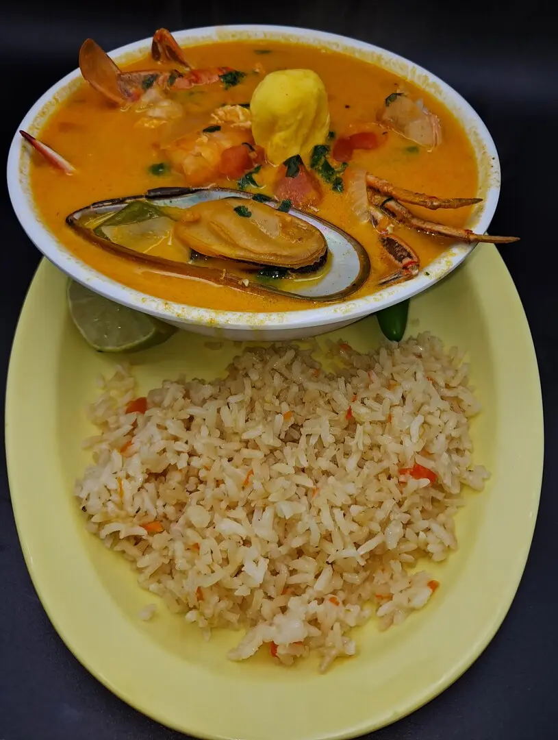 Una sopa de mariscos mezclada con cangrejo azul, camarones, pescado, huevos, verduras y crema salvadoreña servida con arroz y 2 tortillas.