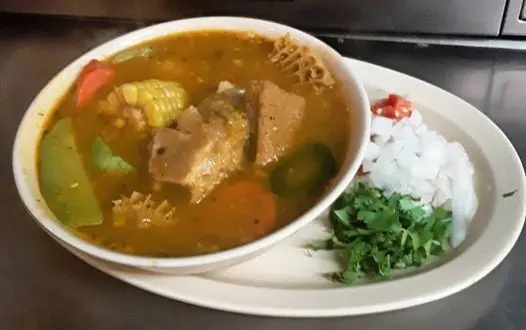 Sopa de mondongo Honey cone Panza y pata de res servida con vegetales picado y 2 tortillas