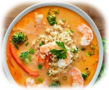 Sopa de camarones con mariscos, huevos, verduras y crema salvadoreña servida con arroz y 2 tortillas.